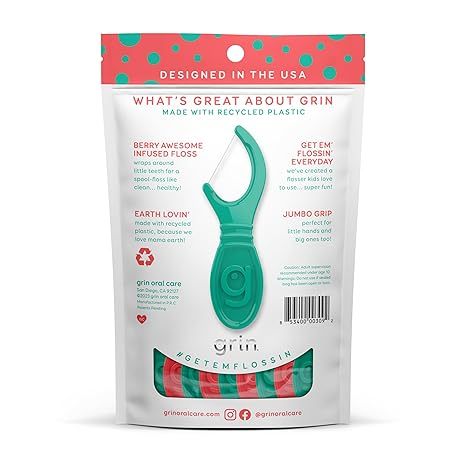 Make flossing fun for kids with Grin Kiddo Flossers. This pack of 80 flossers features a "berry awesome" flavor and is designed to be gentle and effective for little mouths. The packaging is "Earth Lovin'" and made with recycled plastic, giving parents a sustainable choice for their children's oral hygiene.