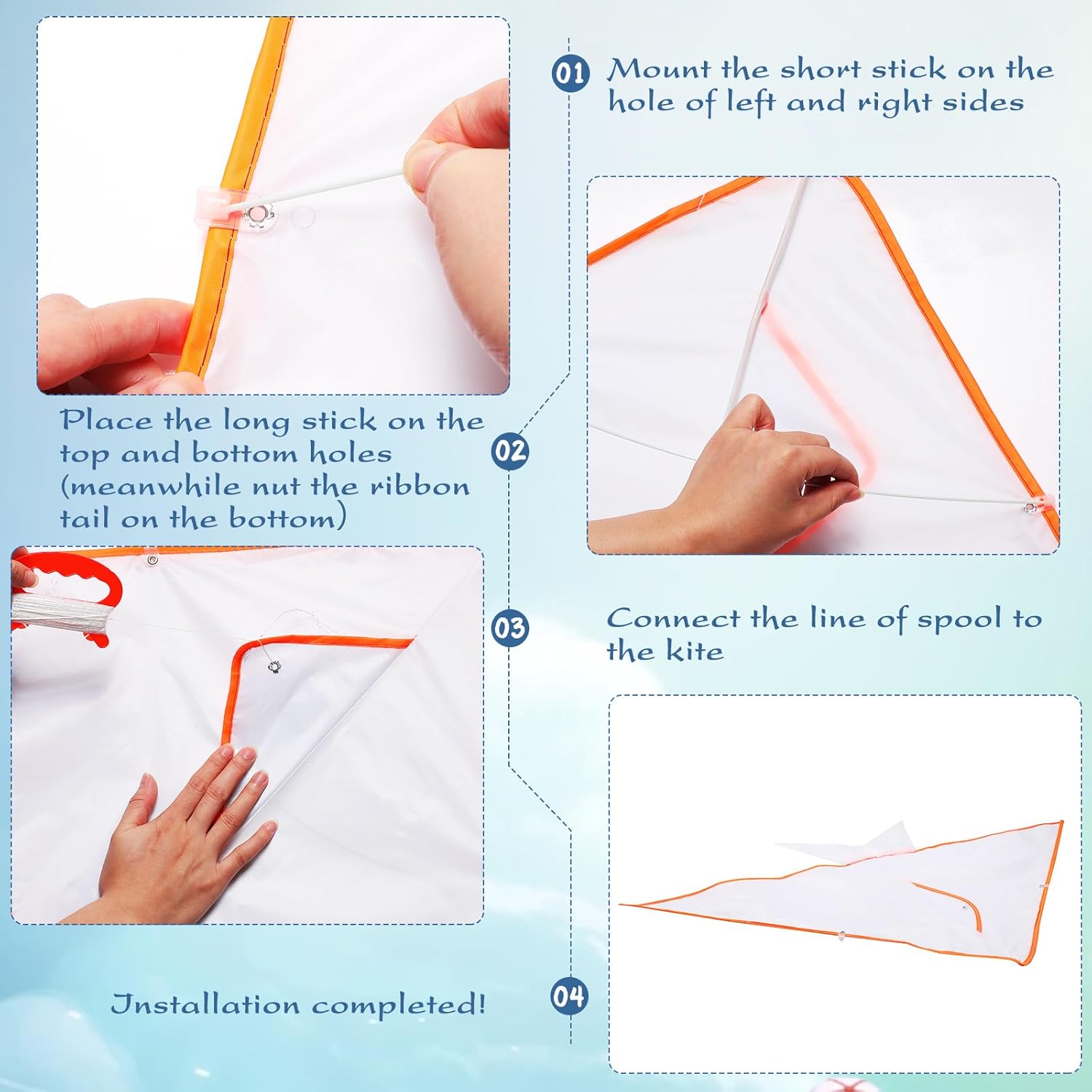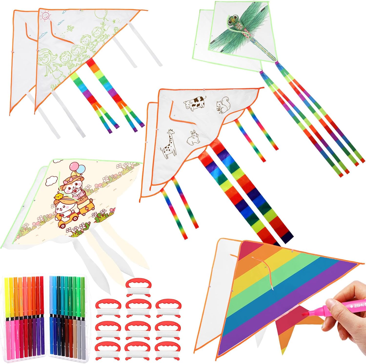 DIY - Kite Making Kit Includes: 10 pieces of blank paper kites in 5 styles (wavy curved, straight triangle, dovetail, butterfly curved and diamond - 2 of each style). Kit also includes 36 watercolor pens and 1 kite line board with 196.85 feet kite line.