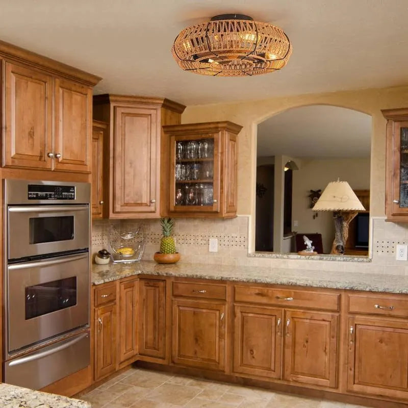 CAGED BOHO DESIGN: The boho flush mount ceiling fan with metal mesh cages are mostly wrapped with twine as a nice vintage decoration, whether your style is an edgy city loft or a laid-back modern country.